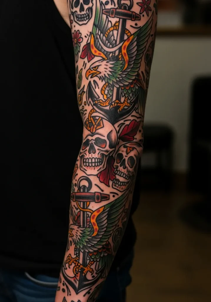 This full sleeve brings together everything that defines the old school style—anchors, eagles, skulls, and vibrant pops of red and green. The details are strong, with the eagle’s wings stretching across the arm and the anchors wrapped in rope adding classic nautical flair. Each skull adds just the right touch of edge, giving the whole piece a timeless toughness.
