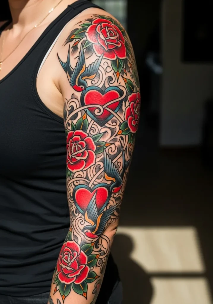I adore how elegant this sleeve feels while still keeping its old school roots. The hearts and roses just scream timeless beauty, and the swallows add a sweet sense of freedom. It’s one of those tattoos that will always look good, no matter the era.