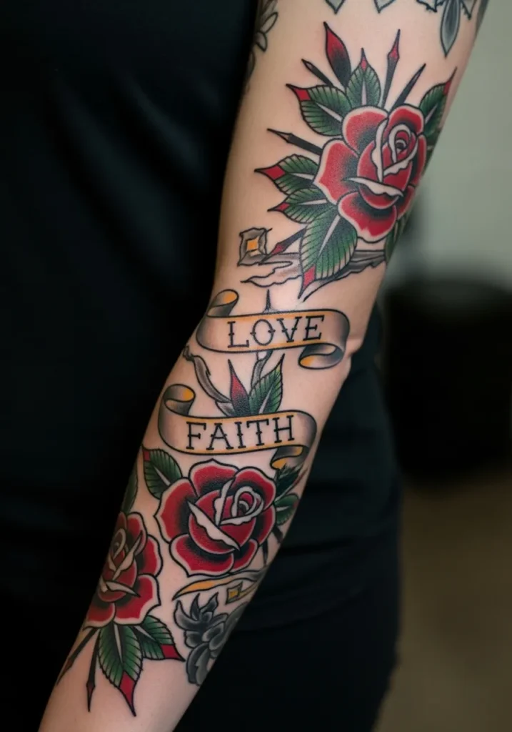 This forearm tattoo is a beautiful tribute piece featuring bold red roses, crisp green leaves, and banners reading “LOVE” and “FAITH.” The design flows seamlessly down the arm, keeping everything clean and bold with thick outlines and traditional shading. The layout feels balanced and elegant without losing that vintage toughness.