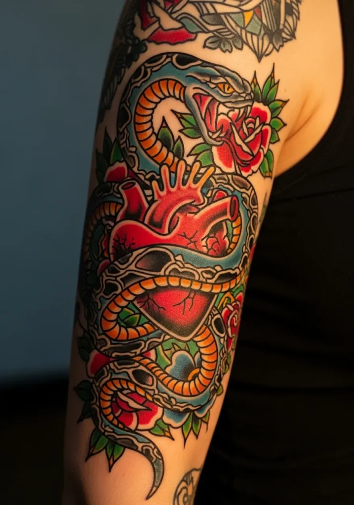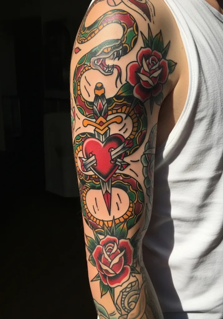 This tattoo captures the essence of American traditional art with a snake entwined around a dagger piercing through a heart. The colors are vivid—bright red, deep green, and touches of gold—and the clean black lines make it stand out from every angle. The surrounding roses complete the sleeve, giving it that balanced, classic composition.