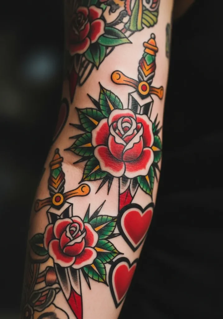 I’ve always had a soft spot for sleeves that tell a story, especially the kind filled with eagles, daggers, roses, and hearts. They carry that old school charm that instantly makes you think of vintage tattoo parlors and the smell of ink and adventure.
