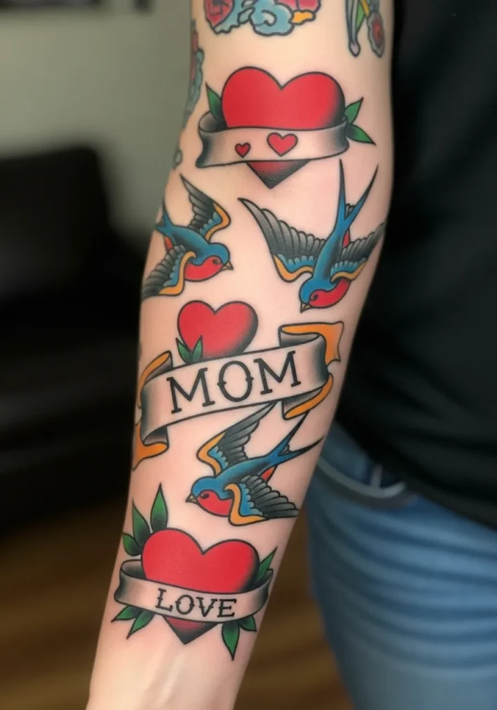 This forearm tattoo keeps things simple and meaningful with traditional hearts, banners, and swallows. The design uses clean black outlines and bright pops of red and blue that make the classic “MOM” and “LOVE” banners stand out. The symmetry and spacing give it a charming old-fashioned appeal.