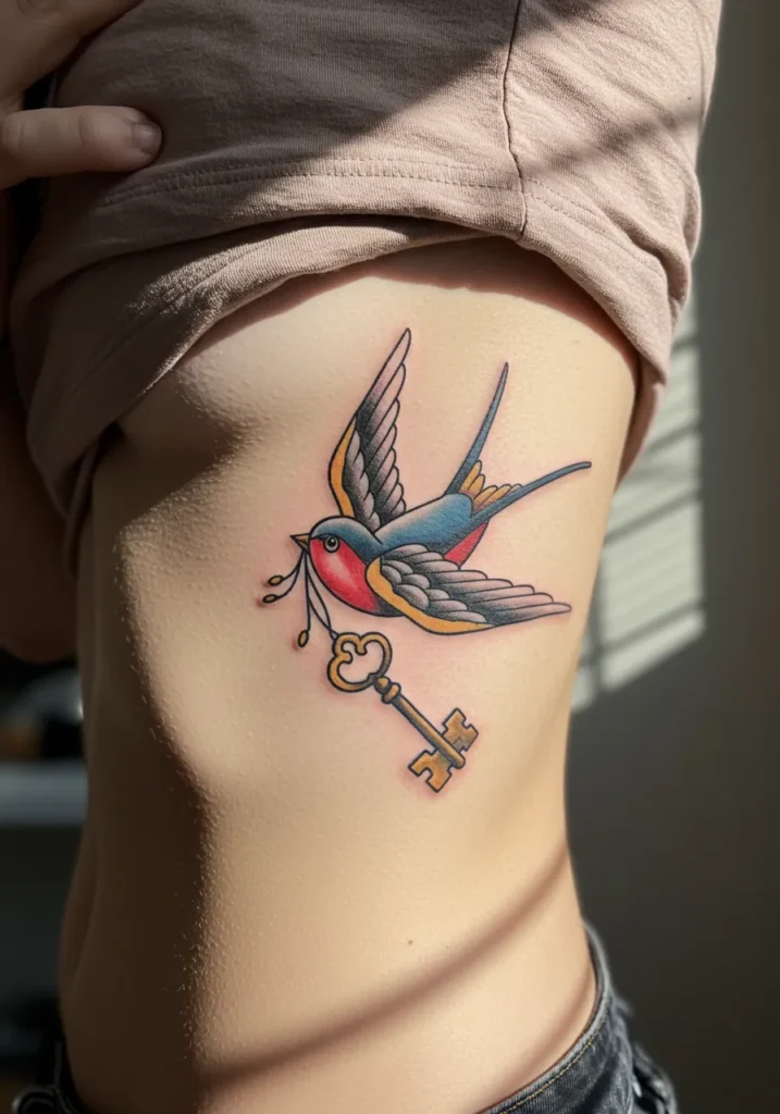 This rib tattoo is all about classic charm. A blue and red swallow takes flight, holding a golden key delicately in its beak. The clean outlines, soft shading, and slightly curved placement flow perfectly with the natural lines of the body. It’s simple, elegant, and full of character — exactly what makes American Traditional tattoos so enduring.