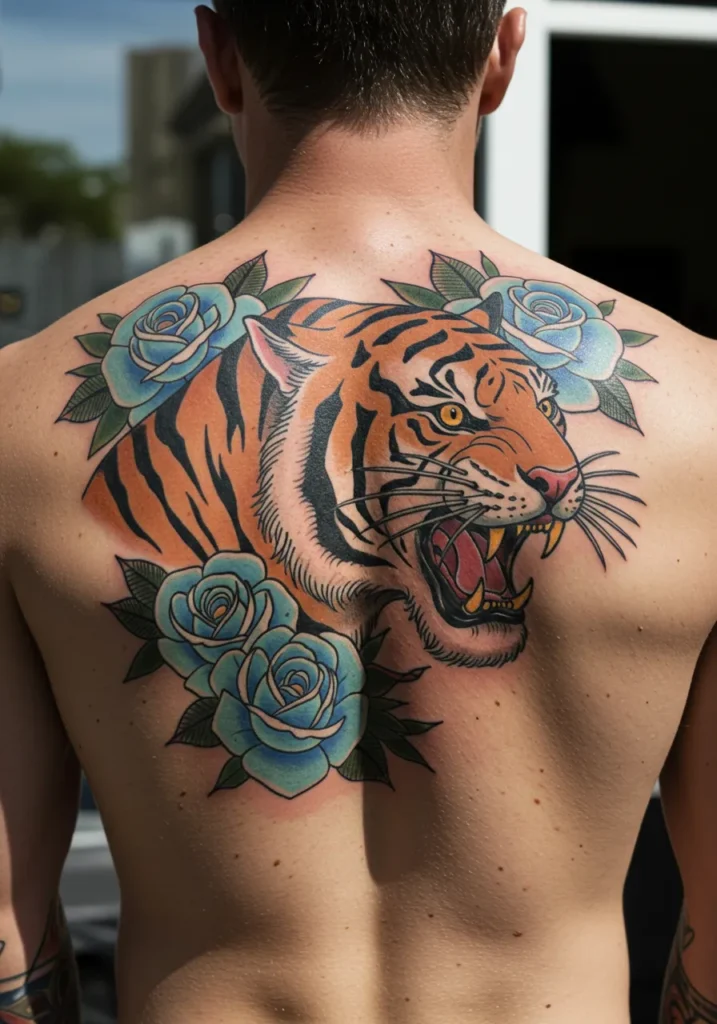 This massive back tattoo features a roaring tiger framed by clusters of icy blue roses. The vibrant orange and black stripes contrast beautifully with the cool tones of the flowers, creating a dramatic yet balanced look. The design spans across the upper back, following the muscles naturally and giving it a strong, dynamic presence.
