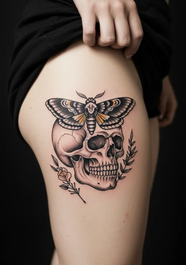 This thigh tattoo pairs a realistic skull with a large death’s-head moth resting on top. The black and gray tones of the skull contrast beautifully with the warm touches of gold and cream in the moth’s wings. A few small flowers and leaves frame the piece, softening its boldness while keeping that classic American Traditional edge.