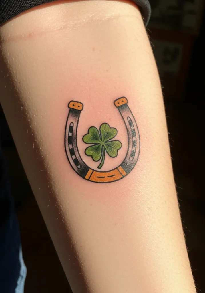 This small American traditional tattoo sits neatly on the upper arm and features a classic horseshoe framing a vivid green four-leaf clover. The bold outlines, warm golden tones, and soft shading give it that timeless vintage feel. It’s the perfect size for a medium placement, detailed yet clean, and it pops beautifully against the skin in natural light.