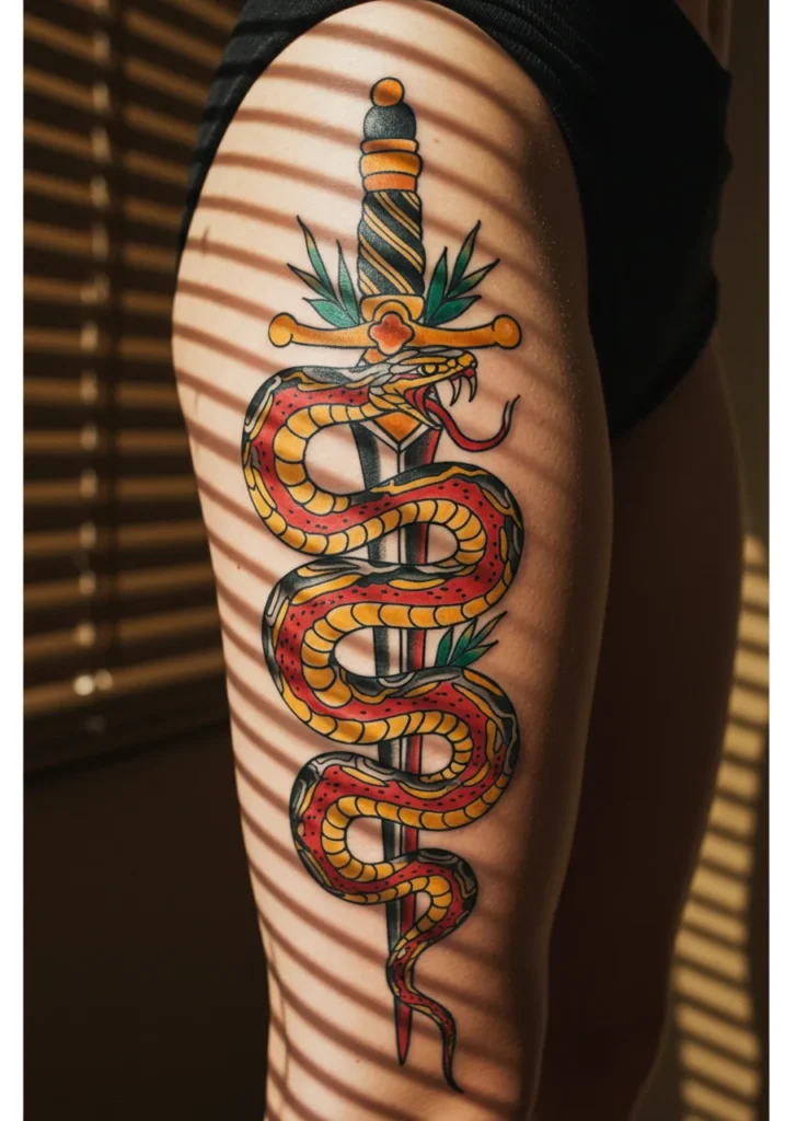 This stunning thigh tattoo features a detailed red-and-gold snake twisting around a dagger with bold green leaves at the hilt. The piece is large, perfectly following the shape of the thigh, and the deep black outlines make every color pop beautifully under warm light. It’s a true American traditional masterpiece with just the right amount of bite.