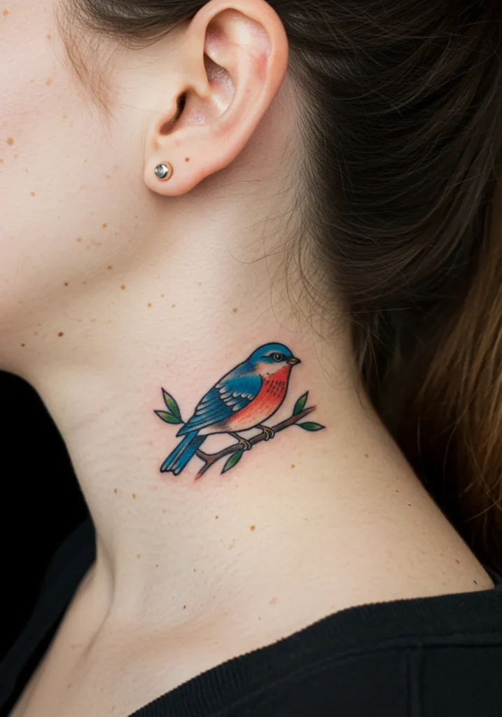 This sweet and delicate neck tattoo captures a small bluebird perched on a branch, blending bright blue and coral tones that feel light and cheerful. The clean linework and small size make it a lovely, subtle piece that still stands out beautifully.