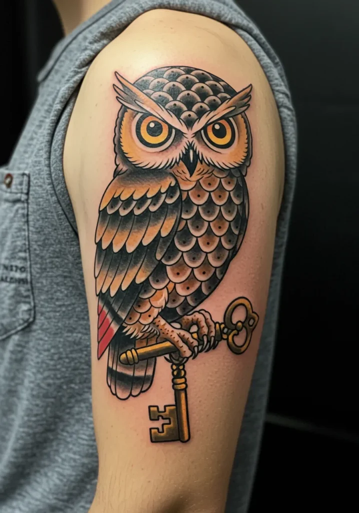 Perched high on the upper arm, this detailed owl tattoo shows the bird gripping a vintage golden key. The shading across its feathers and the mix of ochre, brown, and black tones create gorgeous contrast. It’s bold, balanced, and full of personality—a perfect example of old-school craftsmanship.