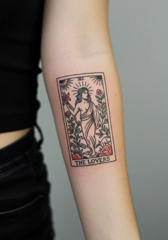 This forearm tattoo reimagines “The Lovers” tarot card with traditional flair—bold black outlines, muted red and green tones, and simple floral details surrounding a graceful central figure. The rectangular frame gives it that tarot authenticity while keeping it crisp and stylish.