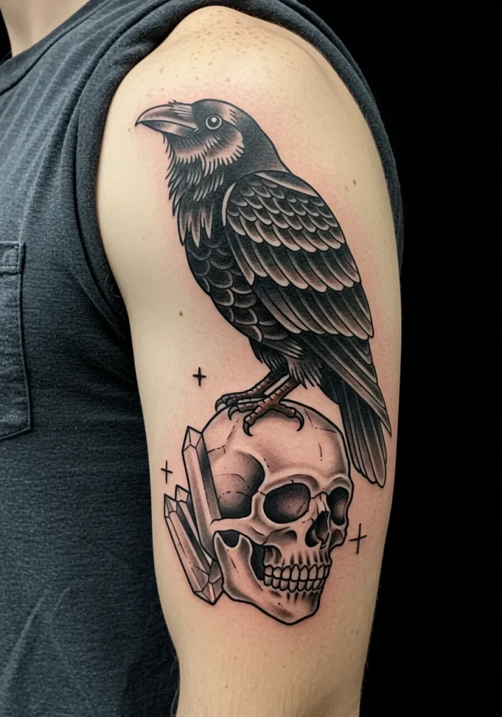 This striking shoulder tattoo pairs a dark raven perched on a skull, surrounded by subtle crystal details. The heavy black shading and muted gray tones give it depth, while the precise linework keeps it bold and clean. It’s a medium-to-large piece that fits the arm perfectly.
