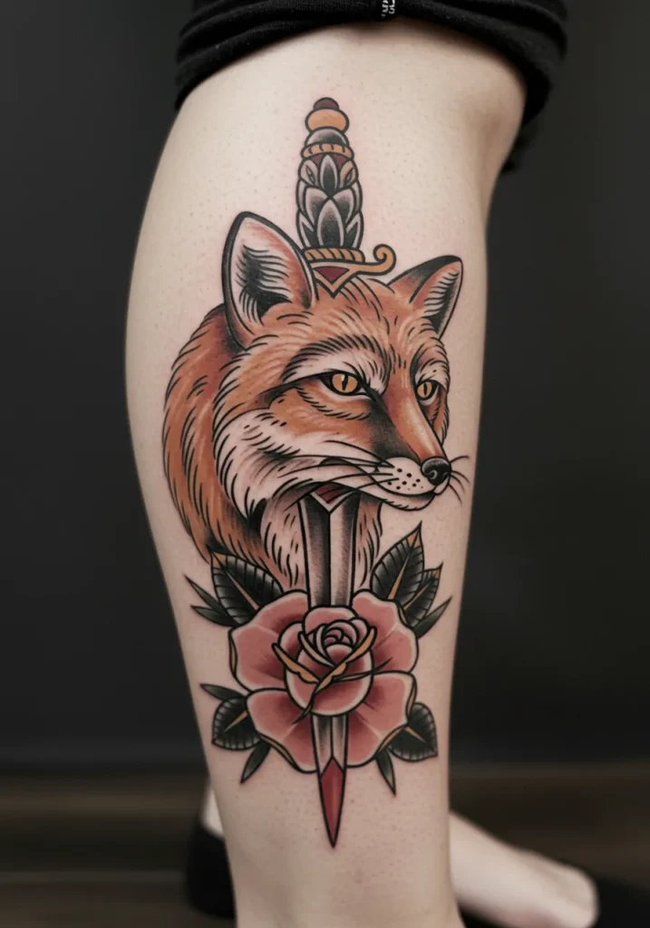 This striking calf tattoo features a sleek fox head framed by a dagger and blooming rose. The warm orange tones of the fox blend beautifully with the red and pink hues of the flower, all tied together with dark green leaves and bold black linework. The design sits elegantly on the leg, giving it a powerful, balanced look from top to bottom.