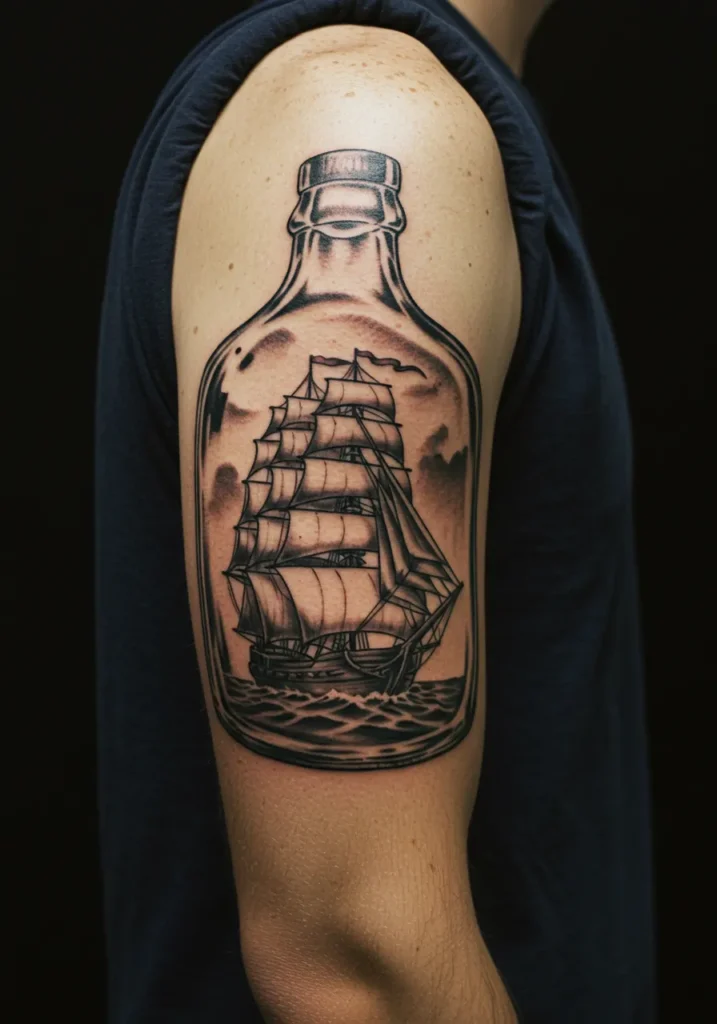 This black and grey tattoo covers the upper arm with a stunning ship sealed inside a glass bottle. The crisp linework and bold shading bring depth to the sails and waves, while the bottle’s curved outline gives the piece a framed, almost storybook feel. It’s traditional tattoo art at its best, strong, clean, and full of symbolism.