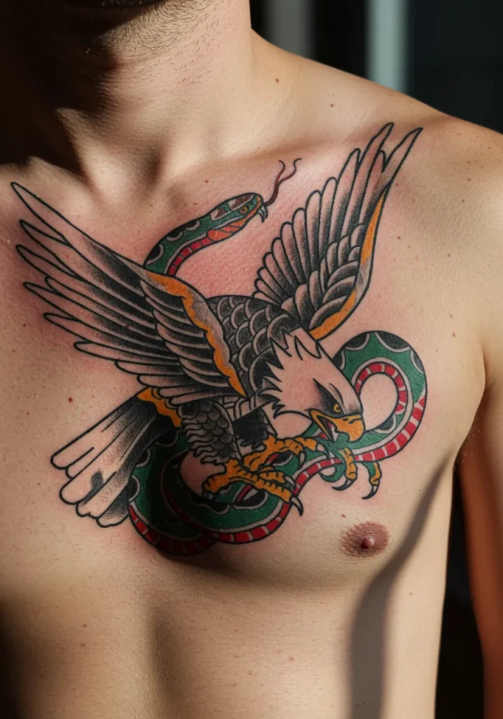 This powerful chest tattoo shows an eagle locked in battle with a snake, rendered in vibrant traditional colors like deep greens, golden yellows, and inky blacks. The wings stretch across the chest, following the natural lines of the body, while the snake’s coils add motion and tension. Every feather and scale pops with bold precision.