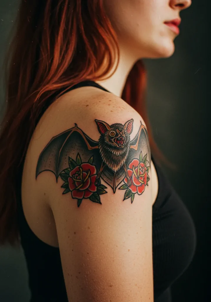 This shoulder tattoo features a dark, wide-winged bat centered between two lush red roses. The wings curve naturally around the shoulder, giving it perfect flow and symmetry. The bat’s eyes glow with tiny details of orange and yellow, adding a touch of mystery against the deep black and gray tones.