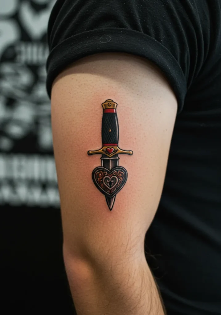 This small yet striking tattoo sits neatly on the upper arm, showcasing a dagger with a black handle and a gold-trimmed guard piercing through a dark ornamental heart. The classic American Traditional linework gives it that bold, timeless edge, while the touches of red and gold add just the right amount of drama. Its compact size makes it an ideal piece for anyone who loves clean, strong designs with symbolic flair.