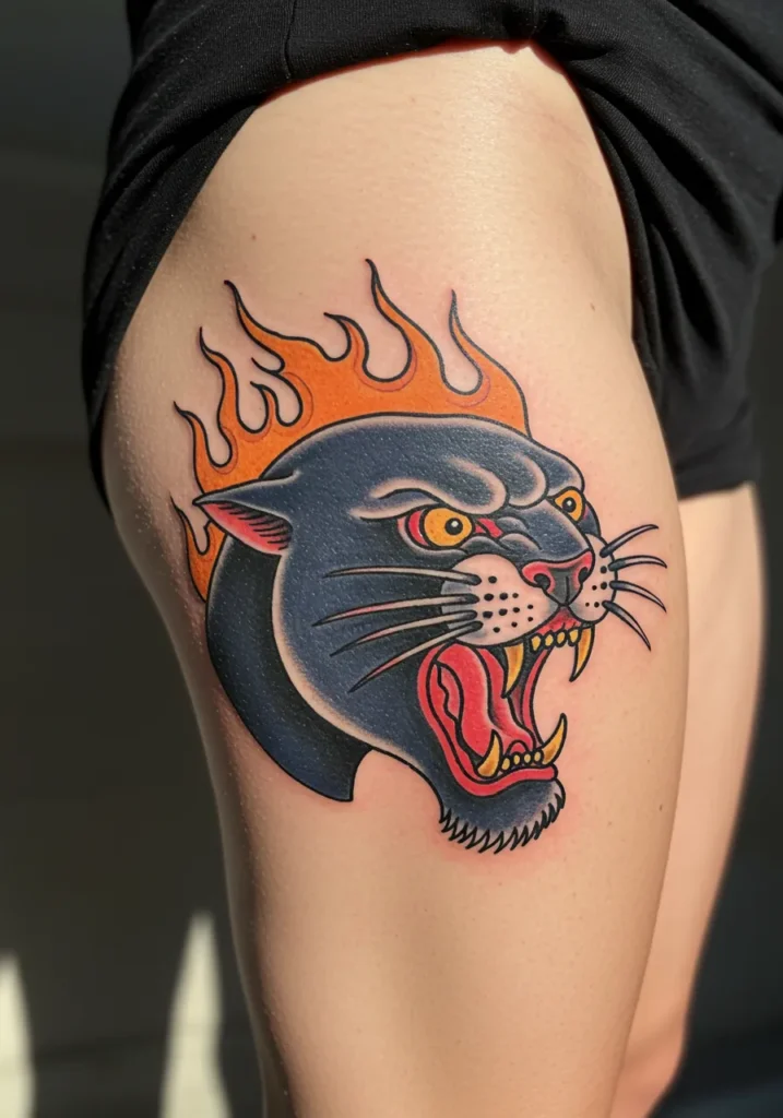 This fiery thigh tattoo features a roaring black panther with flames bursting behind it in vivid orange. The bold outlines, high-contrast shading, and intense expression make it pure old-school energy. The placement on the upper thigh gives it space to breathe, letting the vibrant tones really stand out under natural light.