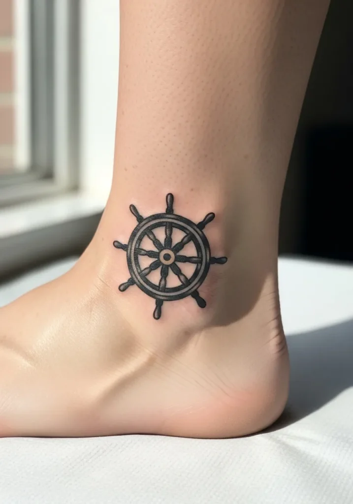 This small American Traditional ship wheel tattoo sits perfectly on the side of the ankle, with crisp black lines and soft shading that give it timeless character. The design’s simplicity makes it stand out beautifully against the skin, capturing the essence of old-school nautical ink in a subtle, stylish way.