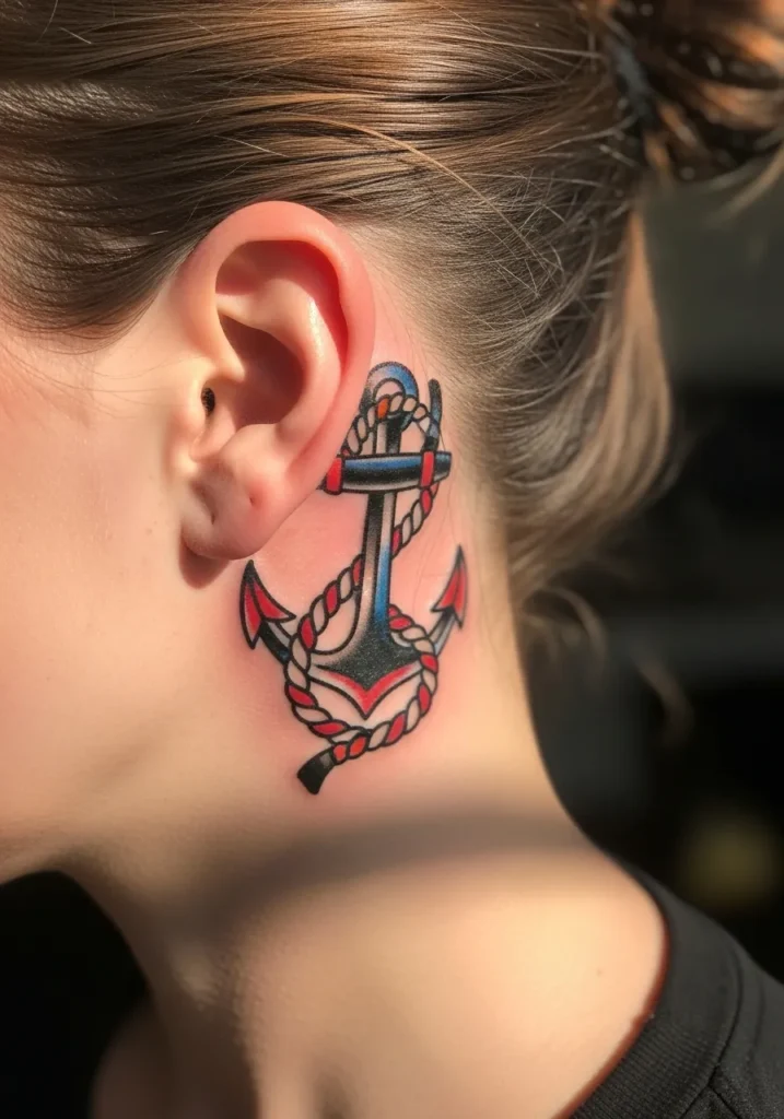 I think this tattoo is adorable because it feels subtle yet symbolic. The anchor always represents stability and strength, and having it behind the ear almost feels like a quiet reminder to stay grounded through life’s waves.