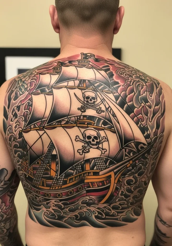 This massive back tattoo depicts a full pirate ship in glorious American Traditional fashion, complete with skull-and-crossbones flags, golden wood tones, and swirling gray seas. The details are incredible, from the rigging lines to the stormy sky wrapping across the shoulders.