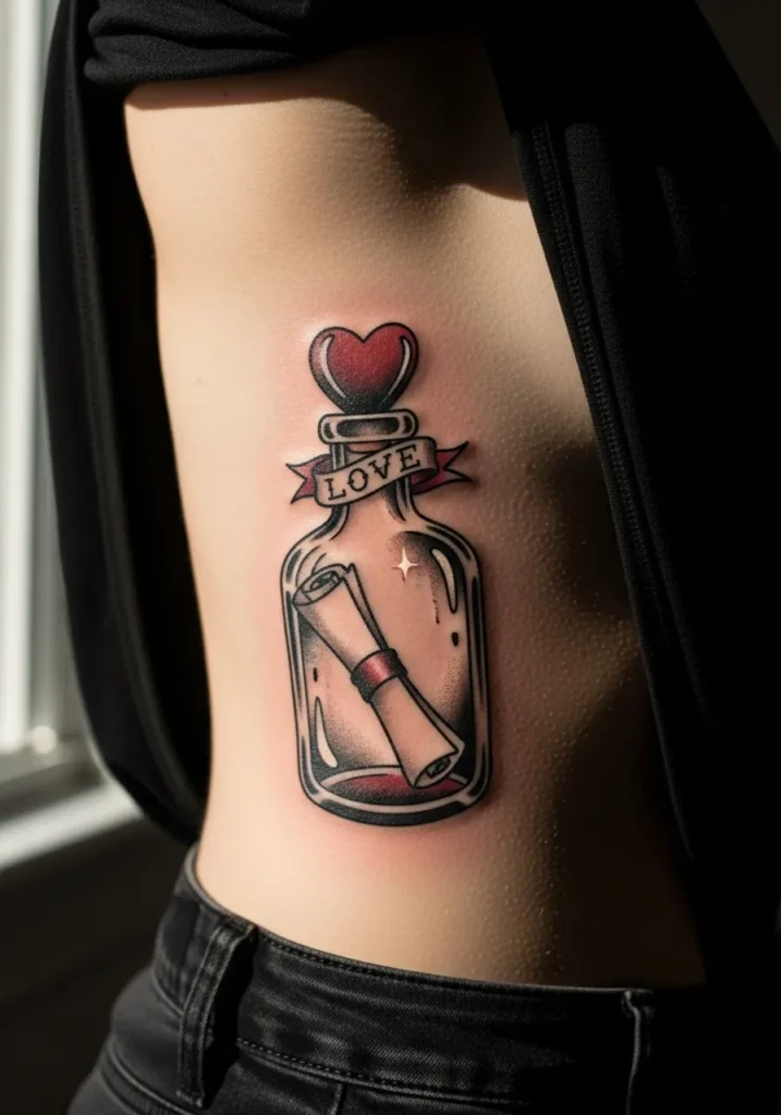 This rib tattoo features a whimsical message in a bottle with a rolled-up scroll inside, topped by a red heart and a banner reading “Love.” The muted reds and blacks give it that true American Traditional look, while the fine placement along the ribs adds a touch of elegance.
