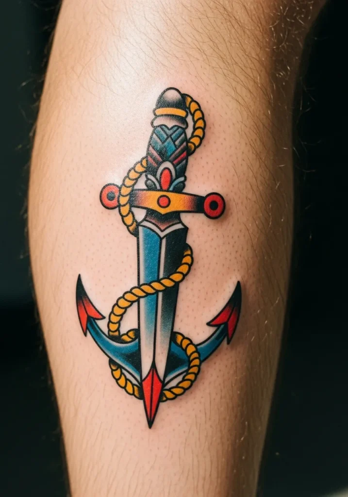 This bold leg tattoo merges a dagger and anchor into one powerful design. The rope detail winds neatly around the center, accented by rich tones of blue, red, and yellow. The clean lines and color saturation make it pop perfectly against the skin.