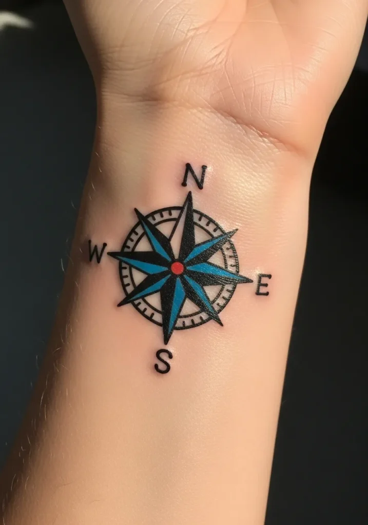 This small wrist tattoo features a bright blue and black compass with clear cardinal letters, standing out sharply against the skin. The compact design is simple yet full of meaning, keeping that American Traditional sharpness while feeling minimalistic and elegant.