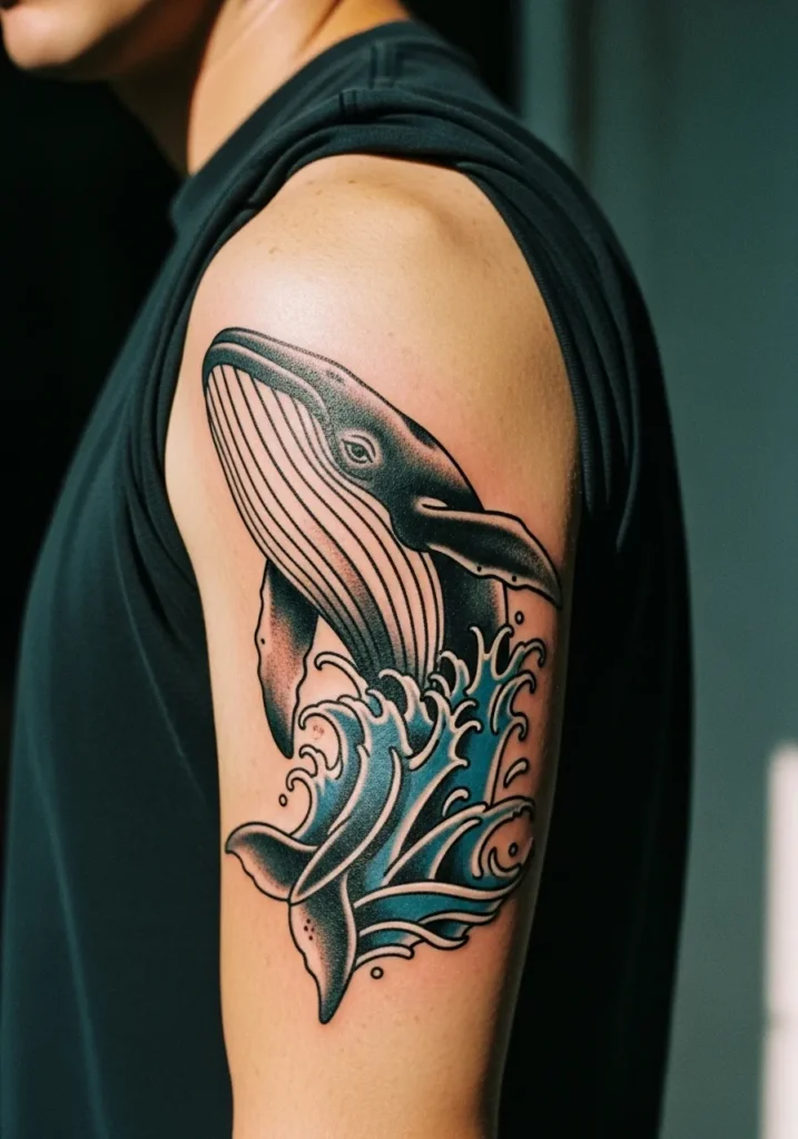 This striking shoulder tattoo features a graceful whale emerging from stylized waves in bold black and blue tones. The shading and flow make it come alive, and the composition fits the arm beautifully. It’s a perfect mix of strength and serenity.