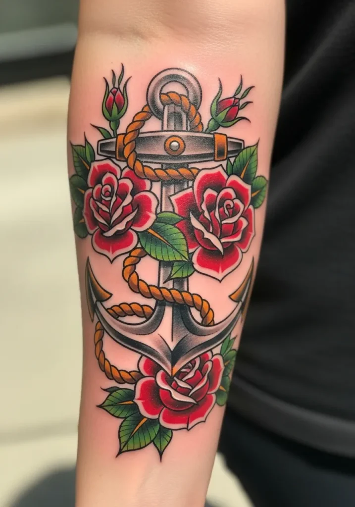 This stunning forearm piece features a traditional anchor entwined with a golden rope and surrounded by vibrant red roses and lush green leaves. The design bursts with color and classic sailor-tattoo symbolism, creating a beautiful balance between strength and romance.