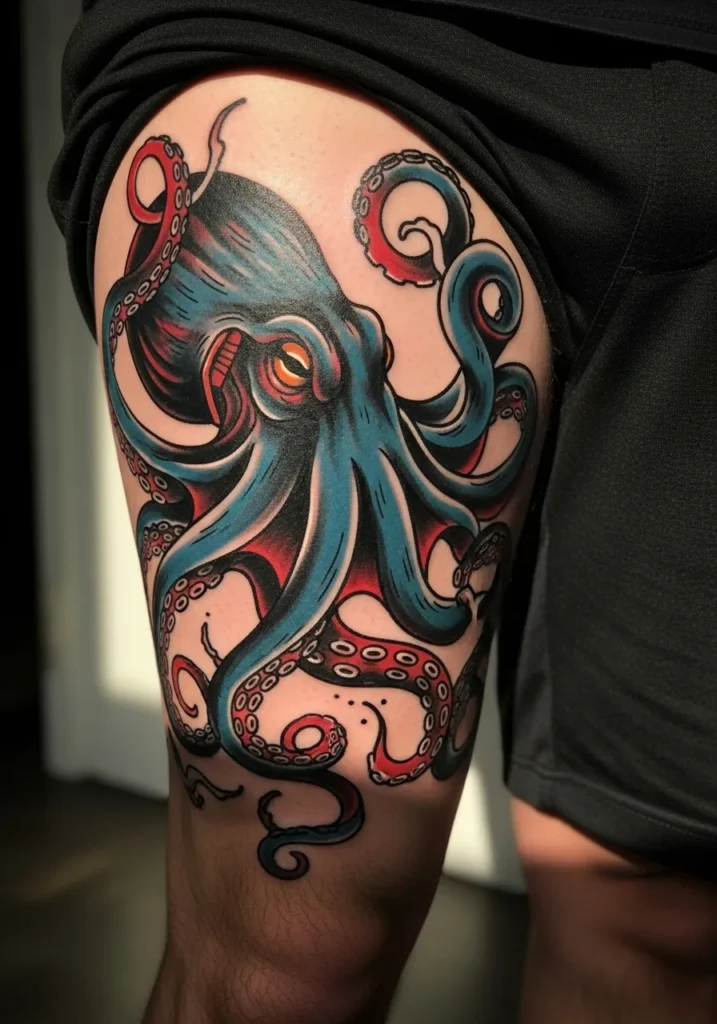 This large thigh tattoo features a bold American Traditional octopus design with rich shades of teal, red, and black. The curling tentacles spread dynamically across the upper leg, creating a sense of movement and strength. The eyes pop with fiery orange tones, giving the sea creature a mysterious, commanding presence that feels alive on the skin.
