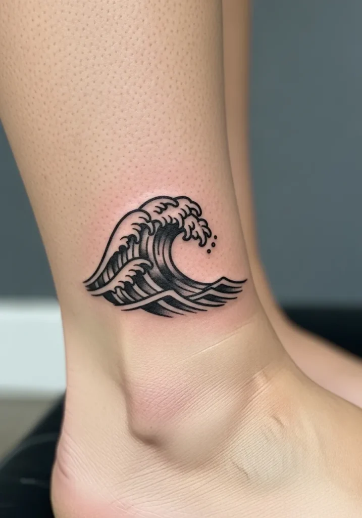 This cute ankle tattoo showcases a simple but striking ocean wave rendered in bold black lines. The clean curves and compact size make it perfect for those who love minimalist American Traditional designs while still wanting something deeply symbolic. It’s small but full of motion, as if it’s forever rolling across the skin.