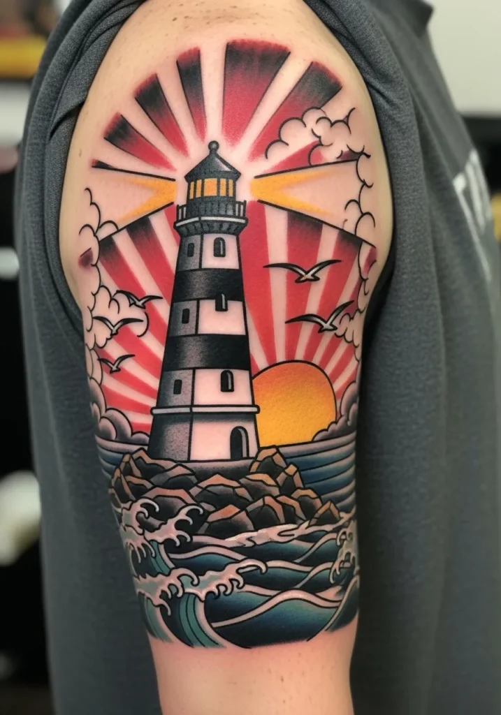 This stunning half-sleeve tattoo depicts a classic black and white lighthouse standing tall against a vivid red sunrise. Waves crash against the rocks below while seagulls soar through the sky, all detailed in that timeless bold-line Traditional style. The glowing yellows and deep blues make it pop beautifully on the arm.
