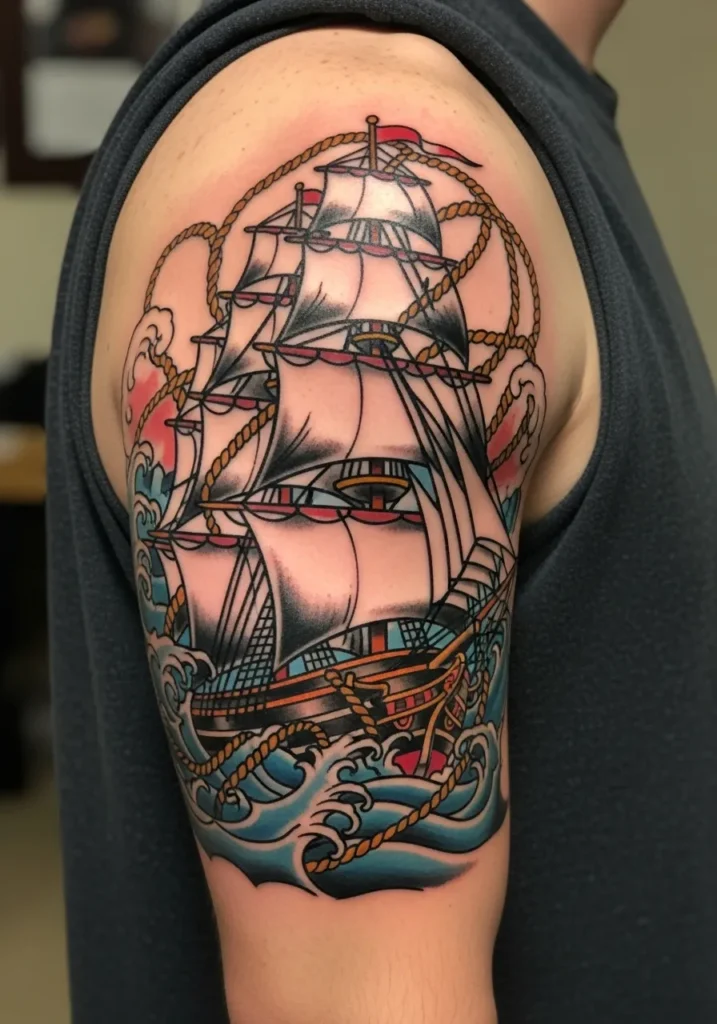 This bold half-sleeve tattoo showcases a tall sailing ship cutting through stylized waves, complete with billowing sails, twisted ropes, and splashes of red, blue, and gold ink. The thick outlines and vibrant colors make it unmistakably American Traditional, giving it that powerful, time-honored look.