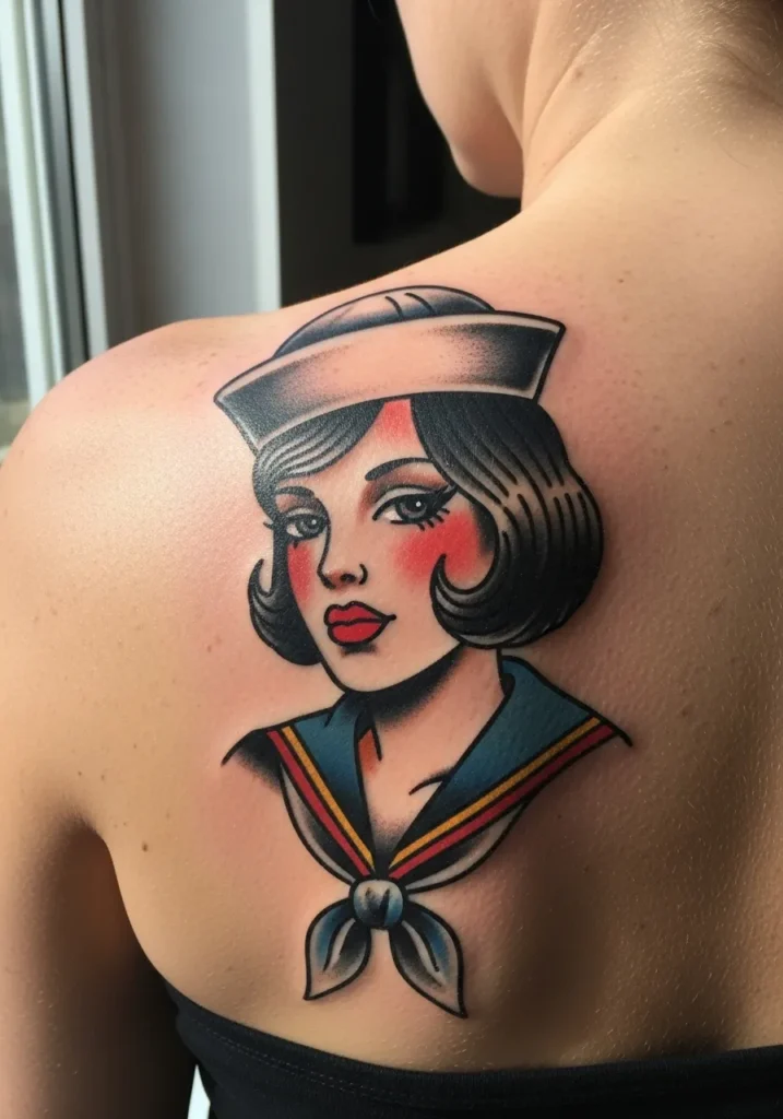 This shoulder tattoo portrays a traditional sailor girl with red lips, blushed cheeks, and a navy-blue uniform. The design stays true to the classic American Traditional palette, using bold black outlines and smooth shading to give her a timeless pin-up look. The placement across the shoulder blade makes it stand out gracefully.