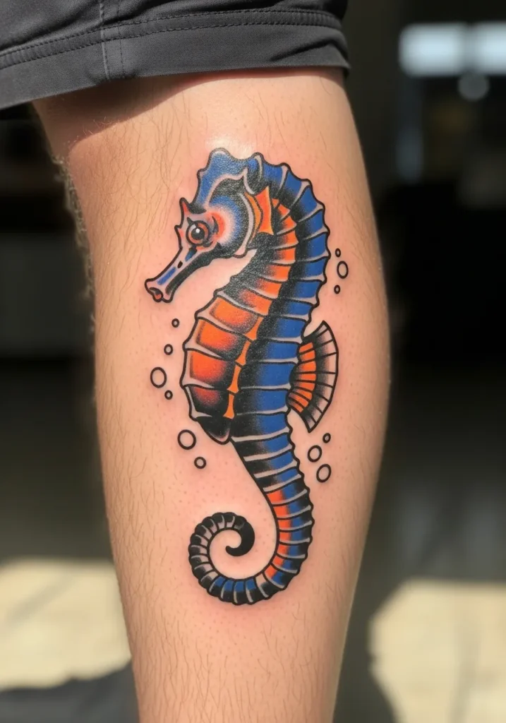 This bright seahorse tattoo features brilliant shades of blue and orange outlined in black, perfectly capturing the vintage sailor style. The details in the scales and curled tail are beautifully crisp, and the bubbles floating around add a fun, aquatic touch. The leg placement makes it both eye-catching and easy to show off.