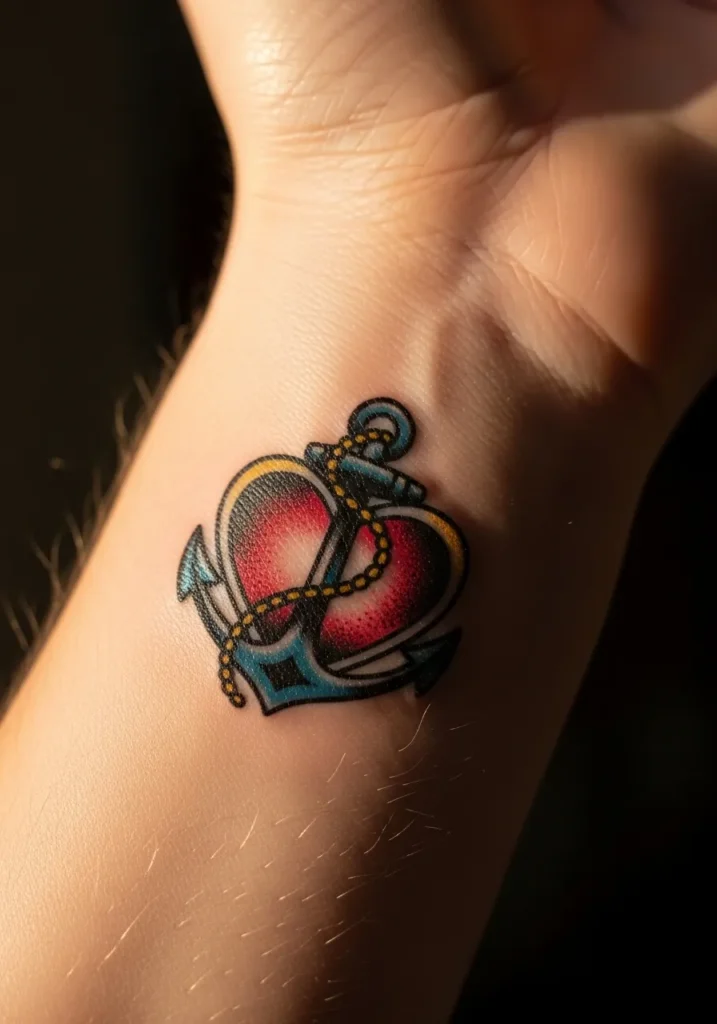 This small wrist tattoo combines a deep red heart with a blue anchor, tied together by a golden rope. The compact design is beautifully shaded, creating a warm glow under natural light. It’s a subtle but meaningful piece that looks charmingly vintage.