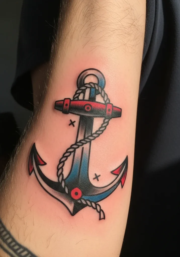 This arm tattoo features a bold American Traditional anchor shaded in cool blues and grays with red accents on the tips. A rope winds neatly around the center, completing the classic nautical look. The crisp outlines and vibrant hues give it that unmistakable sailor energy.