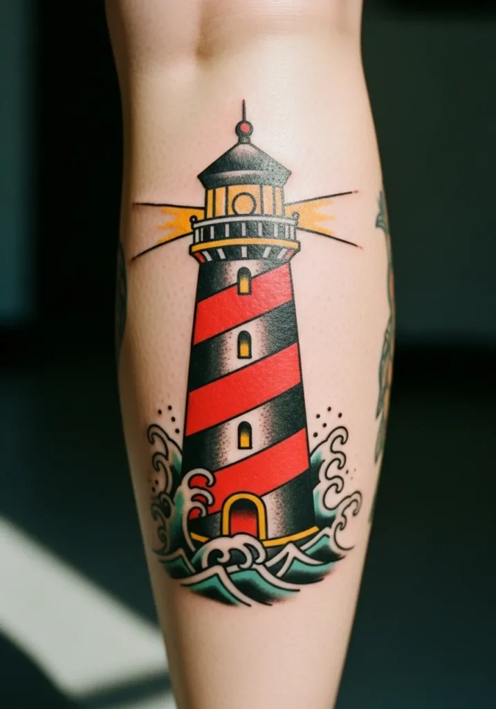 This striking tattoo features a classic red and black striped lighthouse surrounded by rolling ocean waves. The clean lines and bold colors make the piece pop, while the beams of light add a sense of guidance and hope that fits perfectly with traditional nautical symbolism.