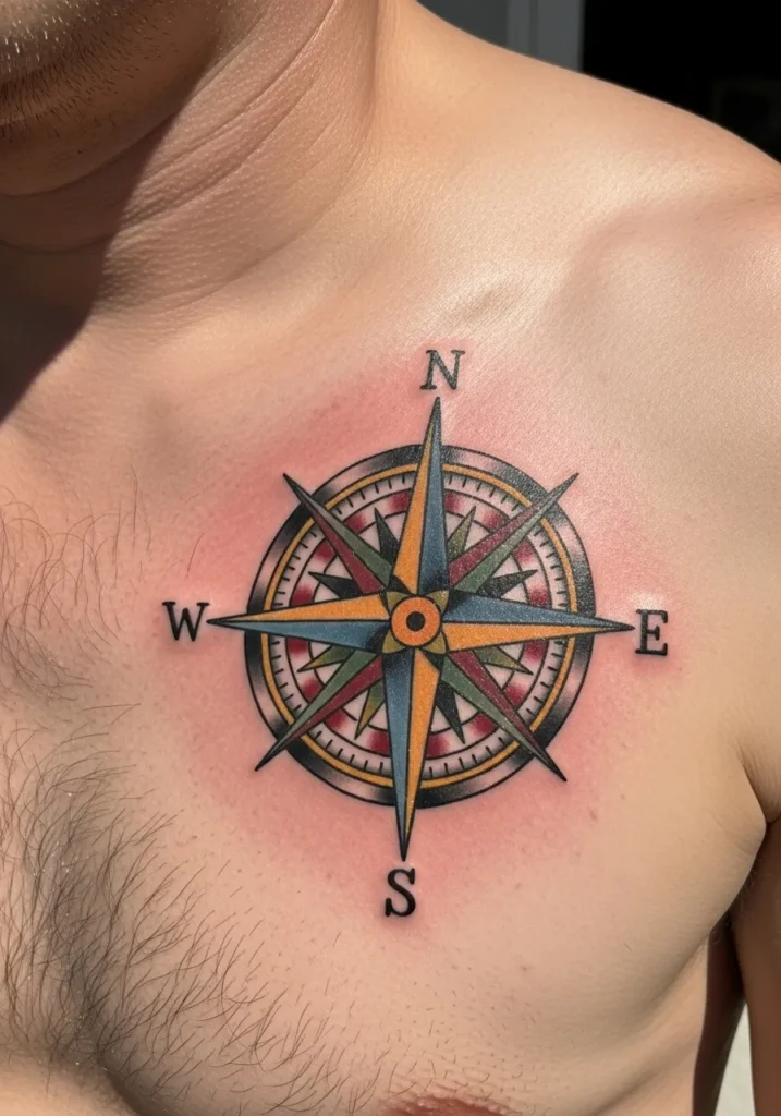This vibrant compass tattoo, centered on the chest, features rich hues of yellow, red, blue, and green with a precise old-school layout. The bold outlines and cardinal letters give it a strong vintage look, and the placement makes it feel personal and directional, almost like it points to your heart.