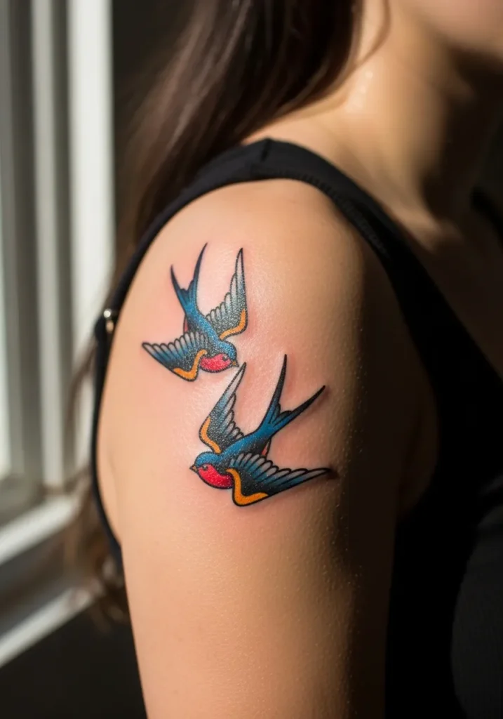 This sweet and vibrant shoulder tattoo shows two colorful swallows mid-flight, outlined in crisp black and filled with bright blue, red, and yellow tones. The style is unmistakably American Traditional, and the placement adds a touch of softness and charm.