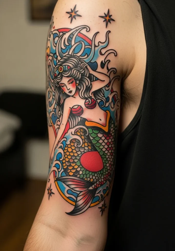 This colorful tattoo features a classic pin-up-style mermaid surrounded by waves and stars, blending turquoise, red, and gold tones in bold traditional lines. The design sits beautifully on the upper arm, creating a striking mix of fantasy and ocean spirit.
