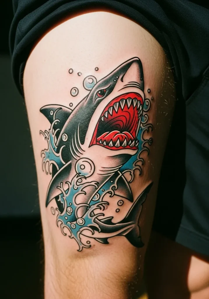 This dramatic thigh tattoo captures a fierce shark bursting from foamy waves with its mouth open wide, outlined in deep black with shades of red, blue, and gray. The dynamic design feels alive with motion, perfectly channeling the raw power of the sea.