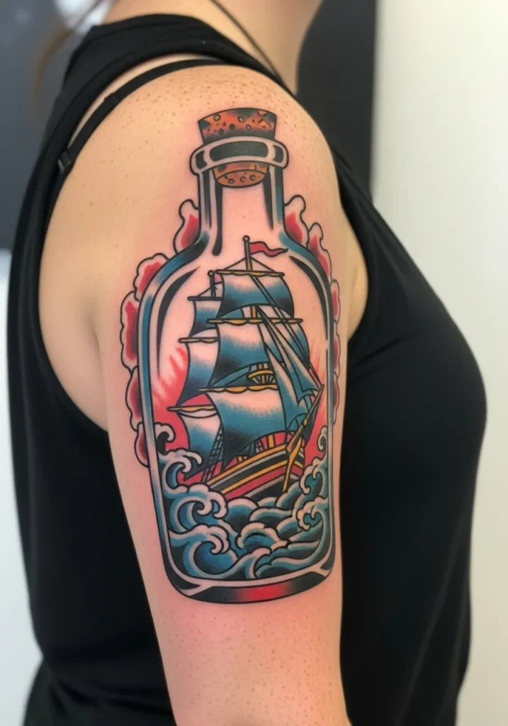 This beautifully detailed piece shows a classic sailing ship trapped inside a glass bottle, floating among swirling waves framed by red and blue hues. The design’s bold outlines and strong contrast make it a perfect nod to traditional sailor-style tattoo art.