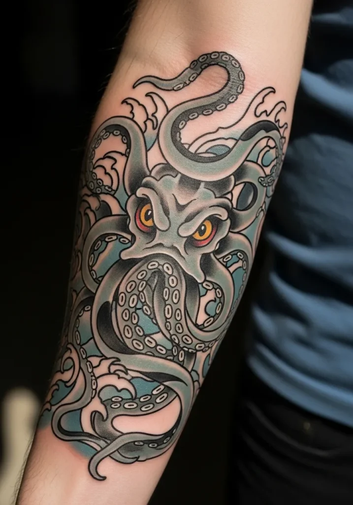 This bold forearm tattoo showcases a menacing octopus, its tentacles curling and twisting with striking movement. The piece features classic American Traditional style with thick outlines, soft gradients of gray and blue, and piercing orange eyes that instantly grab attention. The placement on the forearm makes it easy to show off, while the flowing tentacles perfectly wrap the arm’s shape.