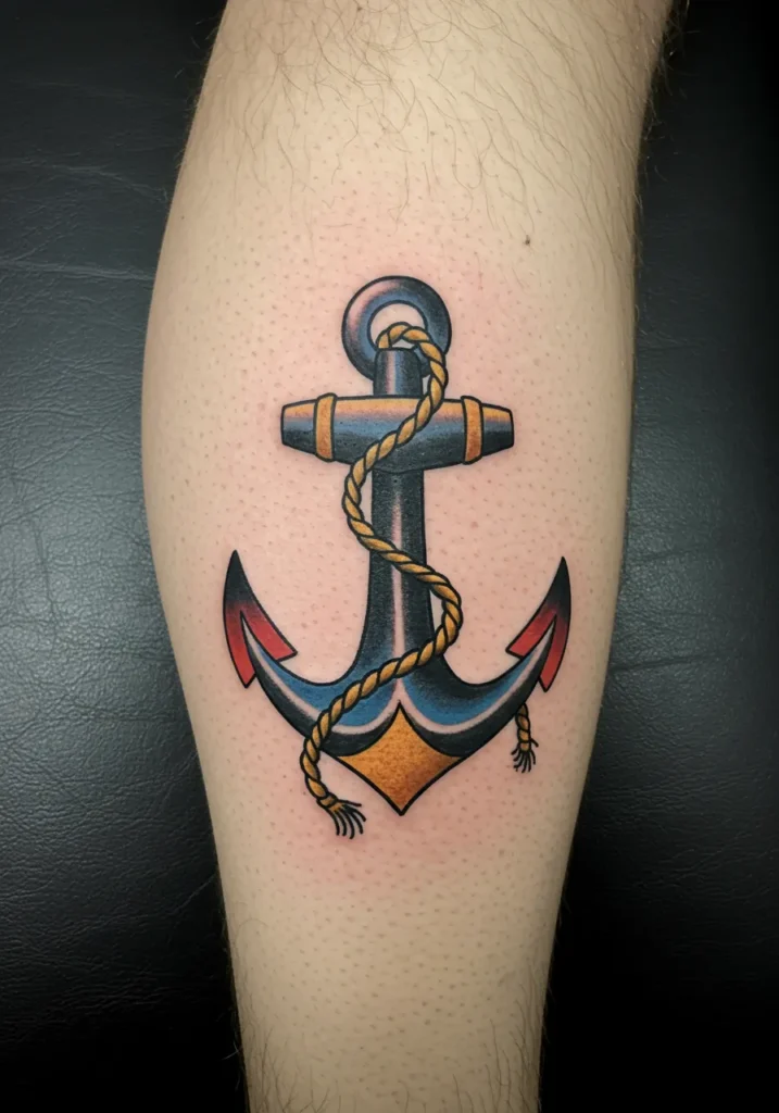 This anchor tattoo sits cleanly on the calf, featuring crisp black outlines, golden rope accents, and hints of red at the flukes. It’s medium-sized and perfectly balanced in composition, capturing that unmistakable American Traditional look with bold shading and smooth gradients. The rope twists naturally around the anchor, adding texture and movement against the soft skin tone.