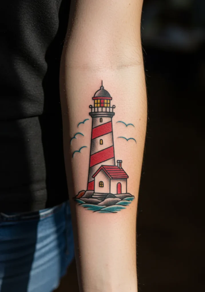 This forearm tattoo features a tall lighthouse with red and white stripes standing on rocky waves beneath a soft sky with tiny blue clouds. The clean lines and crisp colors make it a perfect example of traditional tattoo simplicity done right. The light at the top glows warmly, giving it an inviting, hopeful touch.