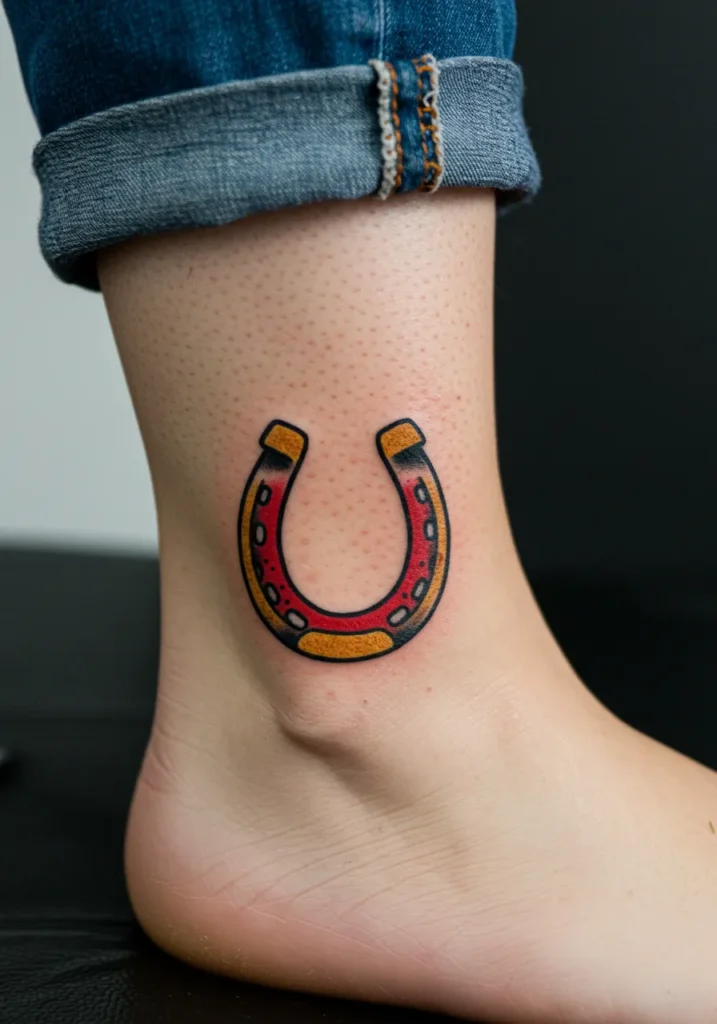 This small ankle tattoo features a bright red and gold horseshoe outlined in black, perfectly curved and shaded for that timeless American Traditional look. It’s neat, compact, and effortlessly charming—a little pop of luck that stands out beautifully against the skin.