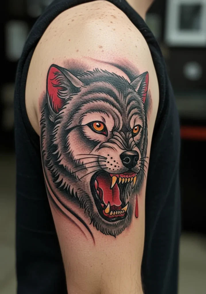 This bold American traditional tattoo shows a snarling wolf head inked on the upper arm. The artist used thick black outlines and solid shading to give it that old-school depth. The wolf’s fur shifts between gray and black, while its piercing amber eyes and blood-red mouth bring it to life. It’s a medium-sized piece that perfectly fits the curve of the shoulder, making it impossible to miss.