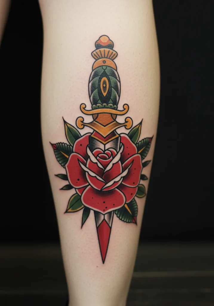 This tattoo features a beautifully balanced design of a dagger piercing through a red rose. It’s placed on the lower leg and done in the true American traditional style with heavy outlines and bold, saturated colors. The red petals, green leaves, and gold dagger handle contrast perfectly, giving the design a striking yet elegant look.