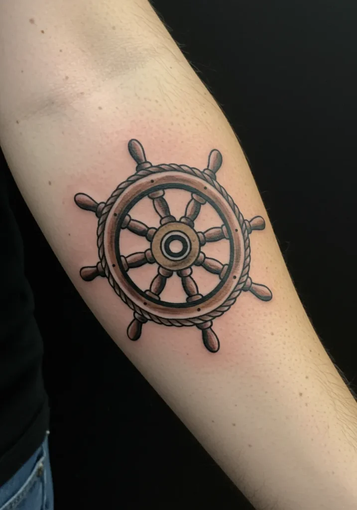 This tattoo of a ship’s wheel sits cleanly on the inner forearm, executed with simple brown and black tones that stay true to the classic sailor-inspired style. The rope detailing and symmetrical spokes give it a crisp, structured look, while the subtle shading adds just enough dimension.